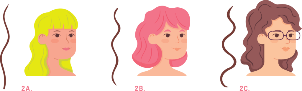 2B: Nesse caso, a marcação do “S” é mais visível e começa mais perto do meio do cabelo. Geralmente, é um cabelo ondulado que apresenta mais frizz no topo da cabeça.